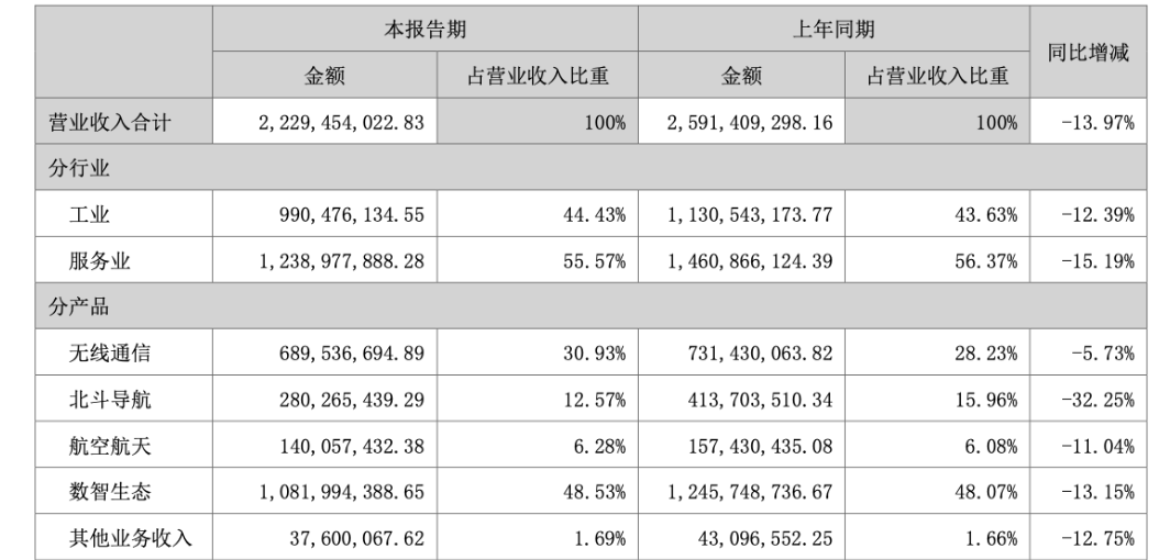今年上半年,海格通信主营产品就已全线走低。具体来看,公司无线通信、北斗导航、航空航天及数智生态营业收入分别下降5.73%、32.25%、11.04%及13.15%。