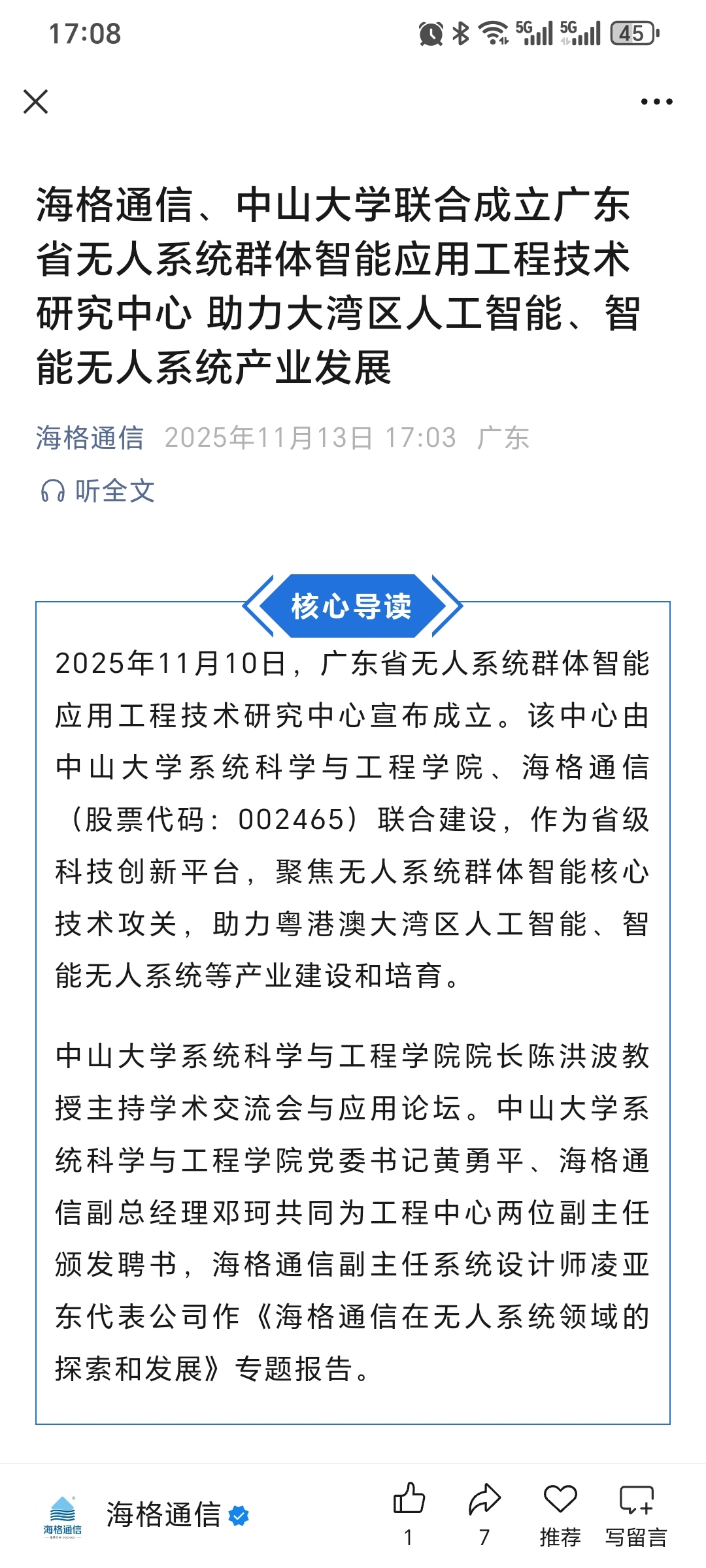 $海格通信(SZ002465)$ 算利好了,跟985合作了