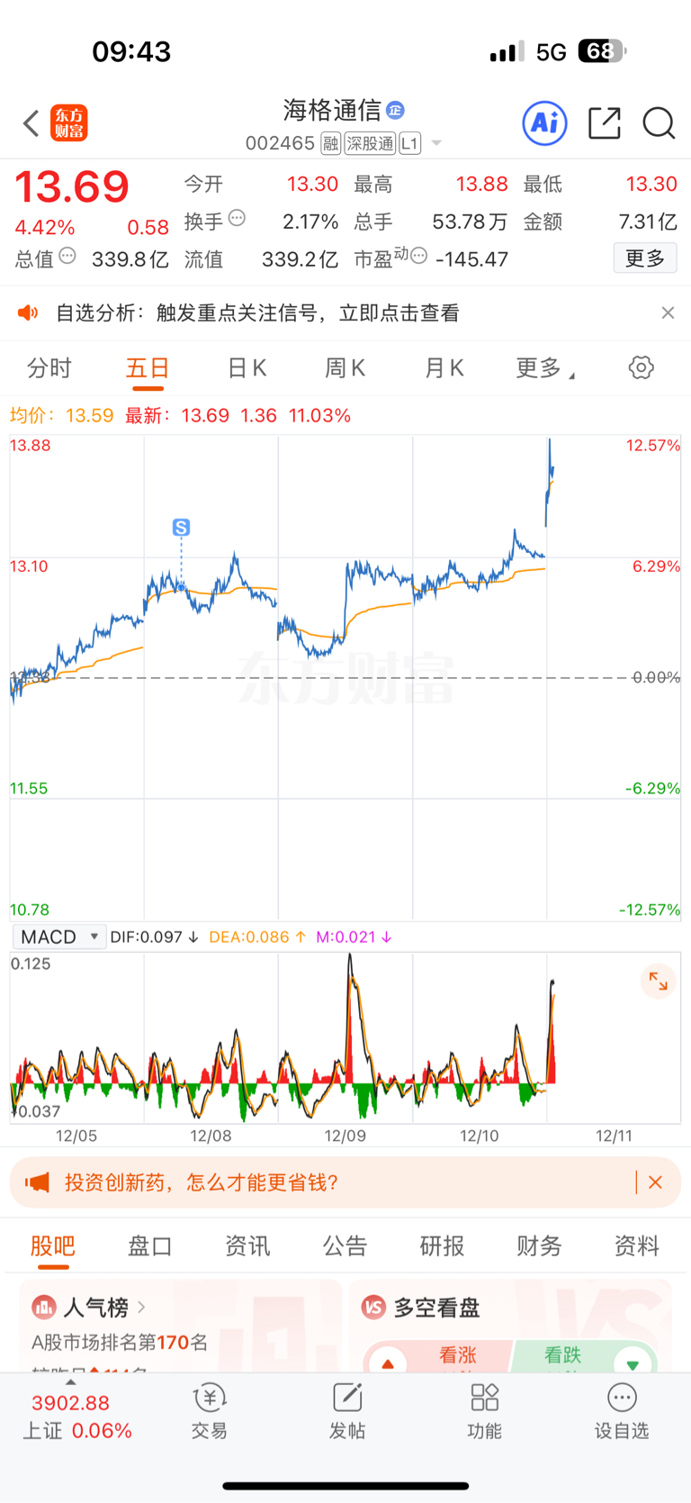 $海格通信(SZ002465)$ 真的是霉,卖的都大涨,拿着的天天跌