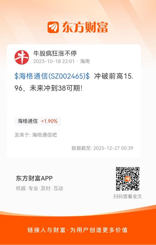 $海格通信(SZ002465)$  冲破前高15.96,未来冲到38可期!