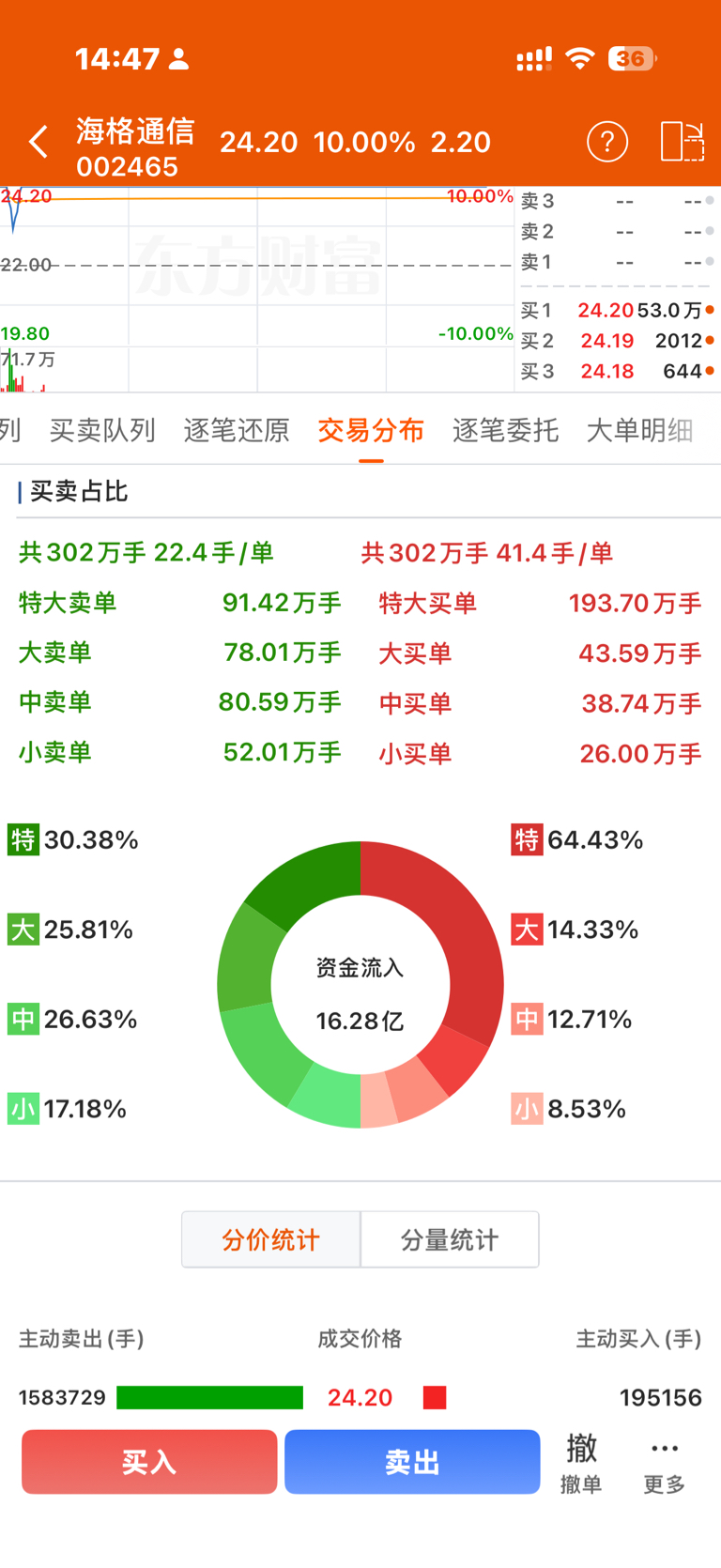 $海格通信(SZ002465)$ 百分之七八十的大单买入!这还担心,基本上都是涨停买的!明天肯定吃溢价!中国卫星今天都没死!