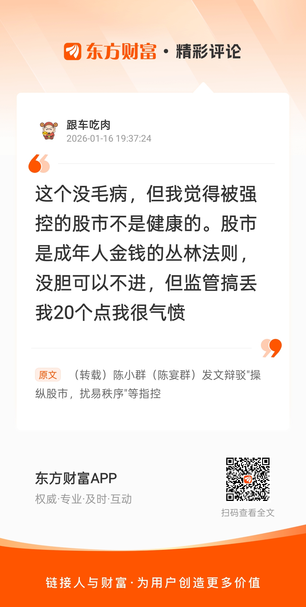2025年1月16日,陈小群发文向监管部门辩驳相关举报信中提及的所谓"操纵股市,扰易秩序"等指控。