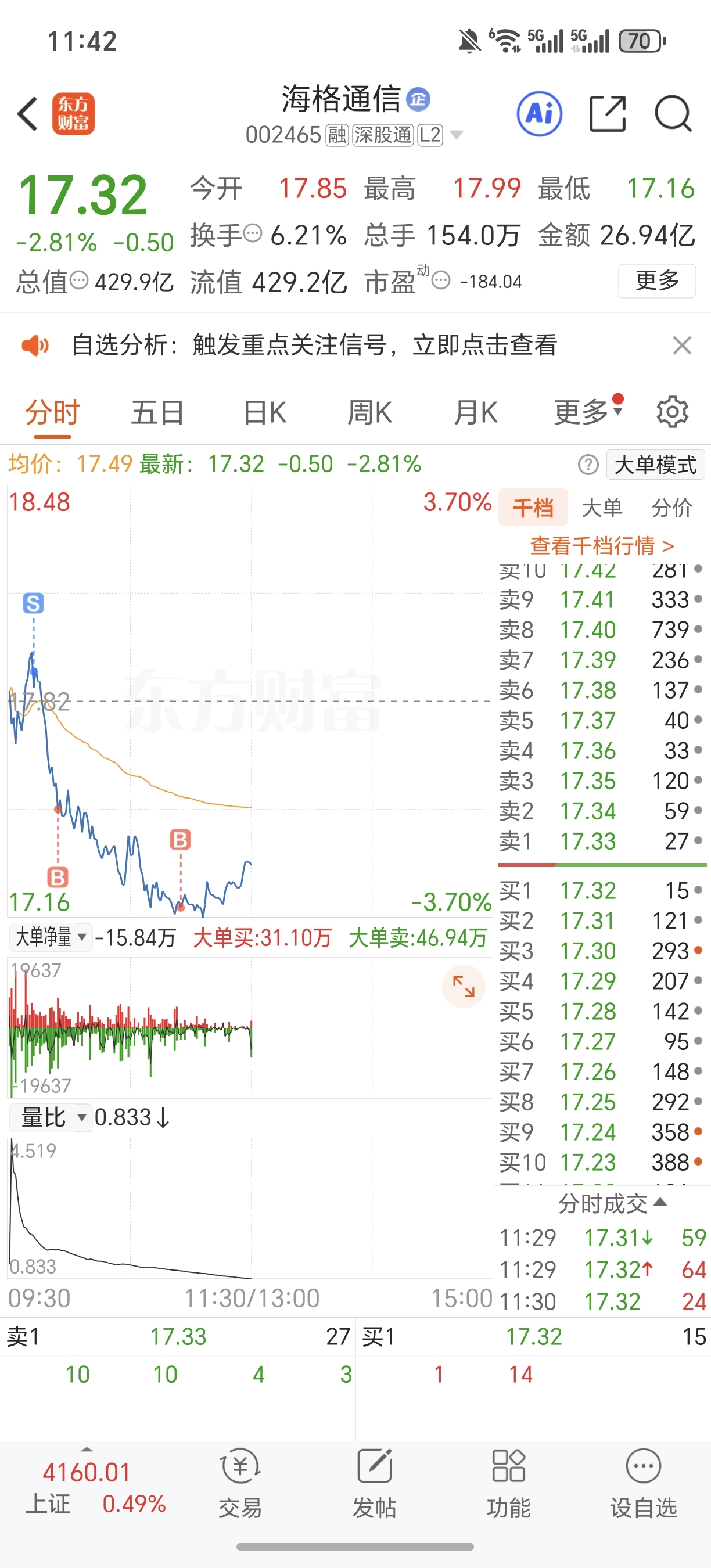 $海格通信(SZ002465)$ 从26.60,补仓,做T到20.50,心累
