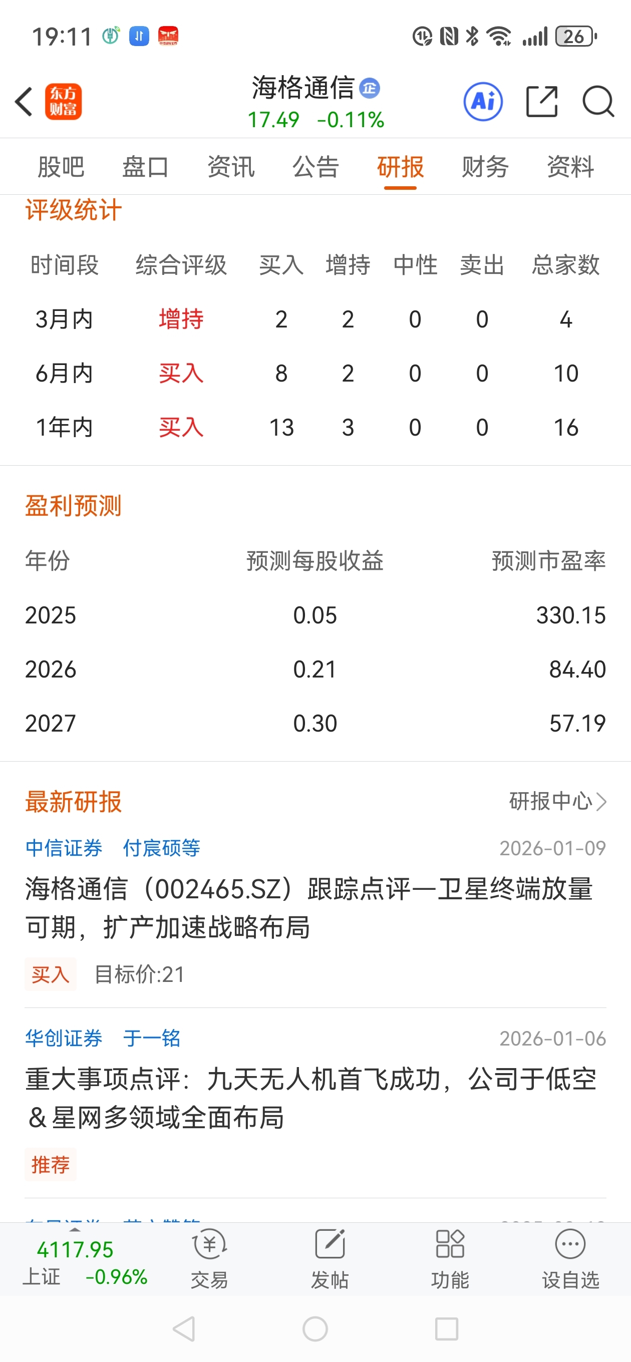 $海格通信(SZ002465)$ 我们都是小散,看不懂业绩报告。我是通过看研报来买股票的。2025年每股收益5分钱,26年0.21元,27年0.3元。有哪一家公司来年能够翻几倍的增长呢?