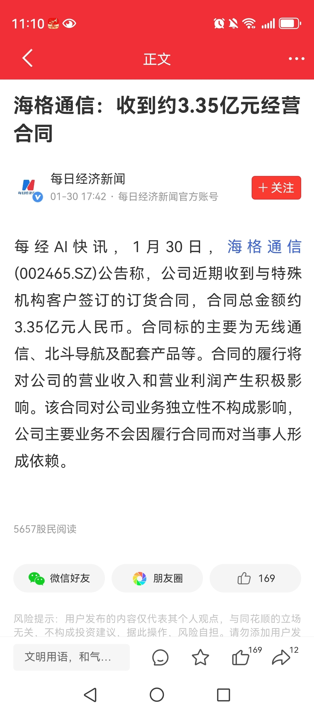 海格通信,公司近期收到与特殊机构客户签订的订货合同,合同总金额约3.35亿元人民