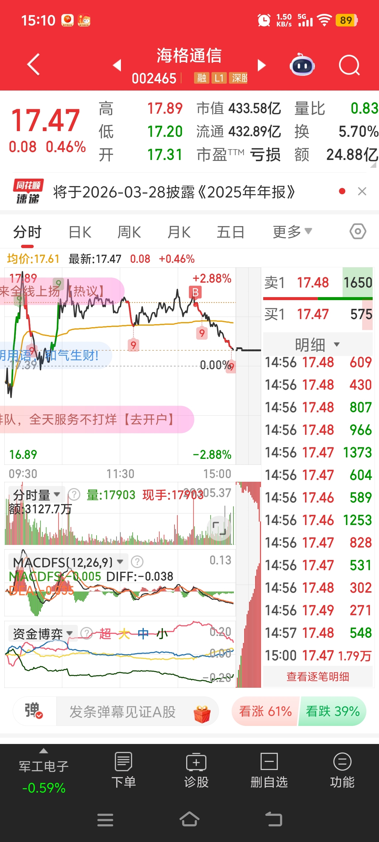 $海格通信(SZ002465)$ 今天全是因为我把他买爆了