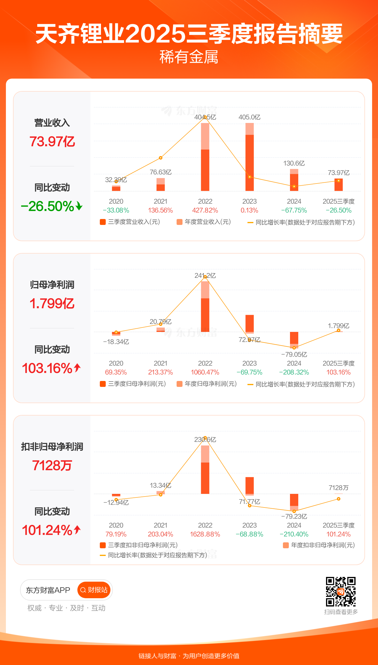 天齐锂业10月30日发布2025年三季报显示,公司前三季实现营业收入73.97亿元,同比下滑26.50%;归母净利润1.80亿元,同比增长103.16%;扣非归母净利润7127.58万元,同比增长101.24%。