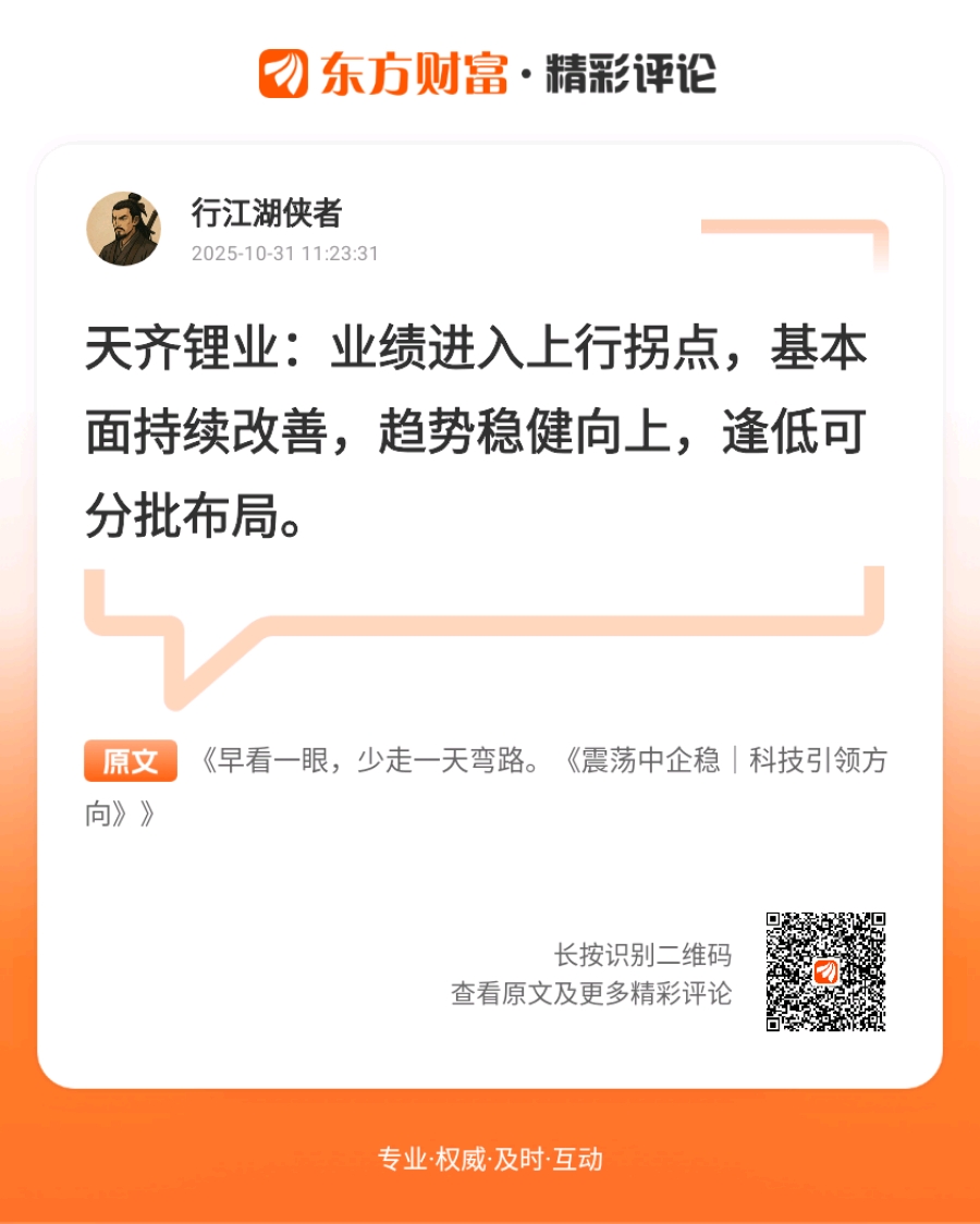 天齐锂业:能源金属+盐湖提锂+固态电池概念,锂矿与新能源领域的龙头,核心业务手握全球高品位锂矿姿源且技术壁垒稳固,旗下格林布什锂辉石矿储量大,成本远低于行业平均水平,在锂姿源供应领域有相当高的话语权。近期呈现明显上涨态势,昨天长阳线突破前方高点接近封板,短期具备强势特征,$天齐锂业(SZ002466)$今天市场保持接力,大概率要继续走强。公司上半年业绩拐点显现出来,基本面持续改善,还跟普洛斯达成战略合作,不仅要在新材料、新能源领域深度合作,还共同组建了相关私募股权基金,进一步拓展发展空间。再加上公司剥离非核心姿产后,姿源更集中于高增长的锂业务赛道,盈利韧性持续释放,随着合作项目推进与锂需求回暖,后续走势还是值得期待,早盘很有观察价值。