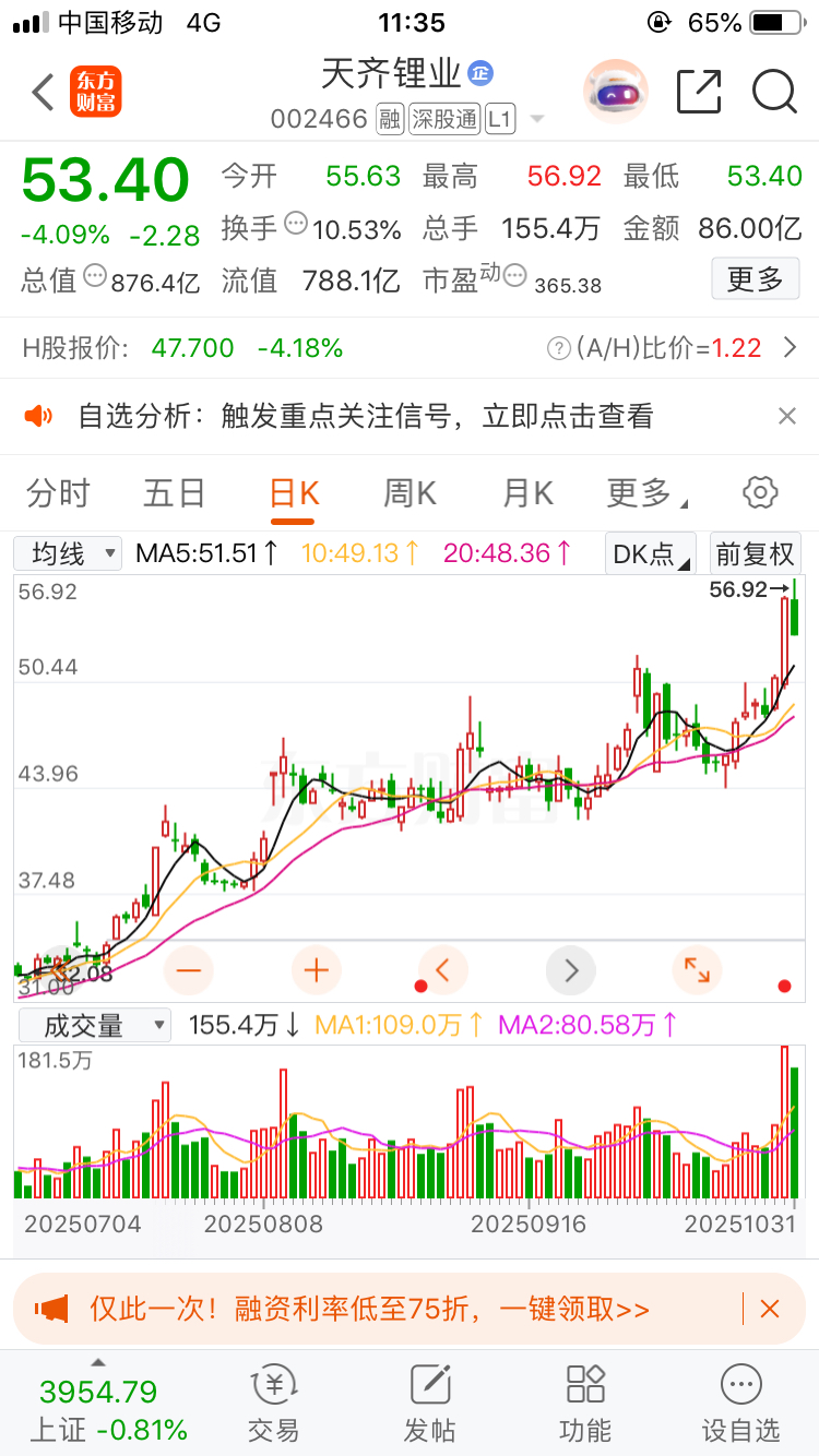 天齐锂业中线看涨,基本面0k,但是此价位不能买,等主力逼仓洗盘,有太多的大户赖着