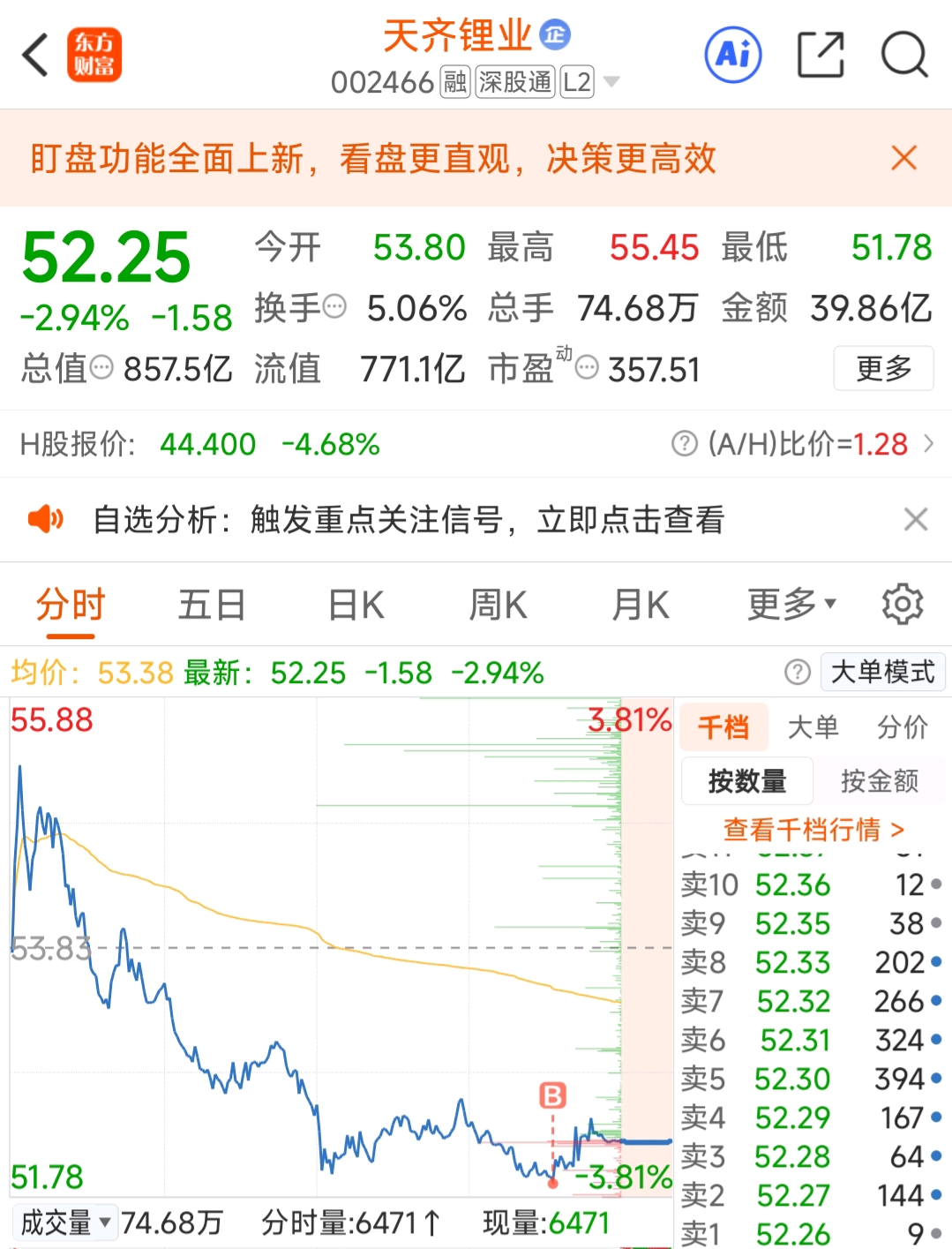 今天验证昨天的大盘属于下跌途中的弱势反弹而已,今天继续缩量向下调整,尾盘虽小V了一下,但是量能明显不足。玩短线的切记先不要开新仓,尤其翻了翻的高位股,切记!切记,切记!天齐今天的走势勉强及格,虽失守5日线,勉强站稳10日线,所以果断加了1成仓。目前成本从40.99到42.69。耐心持有,不要被短期调整洗下车,高位的可以做做T,低位的耐心等待它的向上趋势