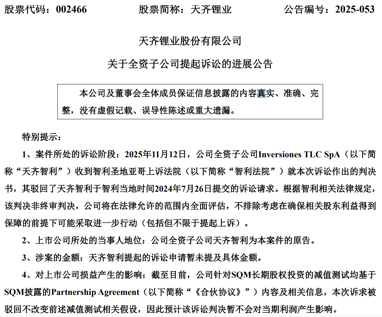 天齐锂业(002466)11月12日晚间公告,2025年11月12日,公司全资子公司天齐智利收到智利圣地亚哥上诉法院的判决书,驳回了天齐智利于智利当地时间2024年7月26日提交的诉讼请求。根据智利相关法律规定,该判决非终审判决。智利化工矿业公司(简称“SQM”)在未经其股东大会审批授权的情况下与智利国家铜业公司(Codelco)签署《合伙协议》,损害了公司全资子公司天齐智利作为SQM股东的投票权以及相关股东权利。公司将在法律允许的范围内全面评估,不排除考虑在确保相关股东利益得到保障的前提下可能采取进一步行动(包括但不限于提起上诉)。