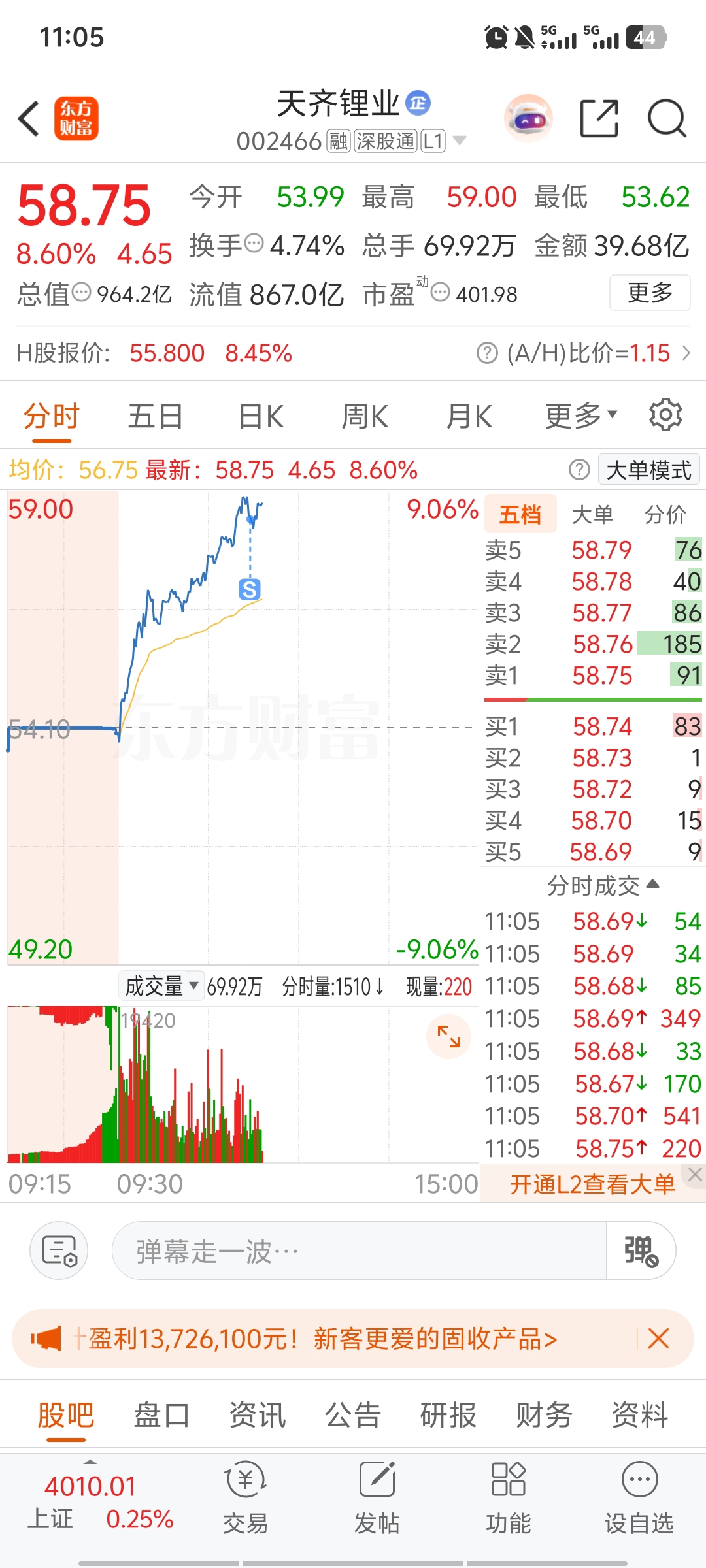 $天齐锂业(SZ002466)$ 周一60没卖,今天也熬不到59了,先走