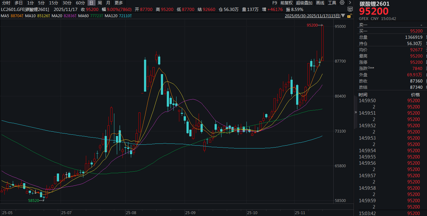 11月17日一开盘,碳酸锂期货迅速拉涨,直至尾盘包括主力2601在内的多个合约集体涨停。