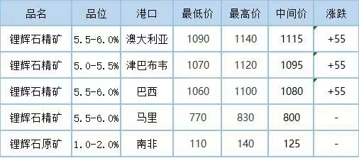 Mysteel数据显示,11月17日,包括澳大利亚、津巴布韦的进口锂辉石精矿价格均有55美元/吨的上调。