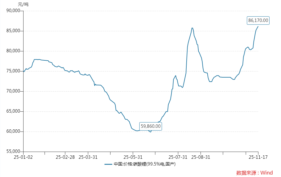 Wind数据显示,11月17日,国内电池级碳酸锂市场均价为8.62万元/吨,较上一个工作日上涨980元/吨。