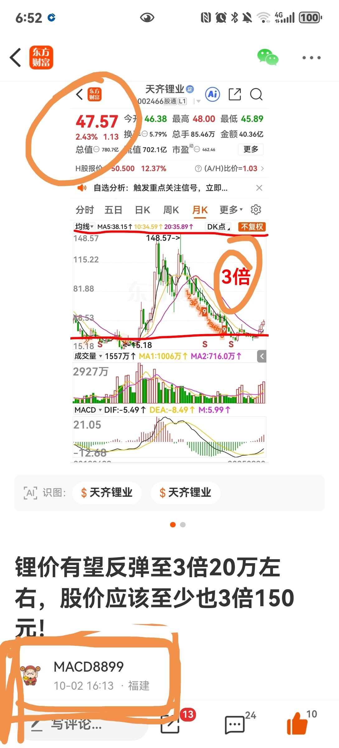2025年10月2日,有朋友问我,和而泰资金出来买什么?我仔细研究一下,科技虽好可真的有点高了,我也恐高。还是选不可再生的资源股,(小金属矿产类):(金和稀土→炒高了我不跟),(银、铜、铅锌锗→还没炒太高有进主升的感觉),最好的是锂矿(每吨从60万跌到6、7万元,短期反弹先看到每吨10万元,中长期应该是60元的黄金倒分割位0.382*600000.382*600000=229200元。。看好$天齐锂业(SZ002466)$ 和$盐湖股份(SZ000792)$ ,,$锂价若反弹涨3倍20万,股价应该是至少3倍,天齐和盐湖两个的短期目标100元和50,中长期目标150和100元!