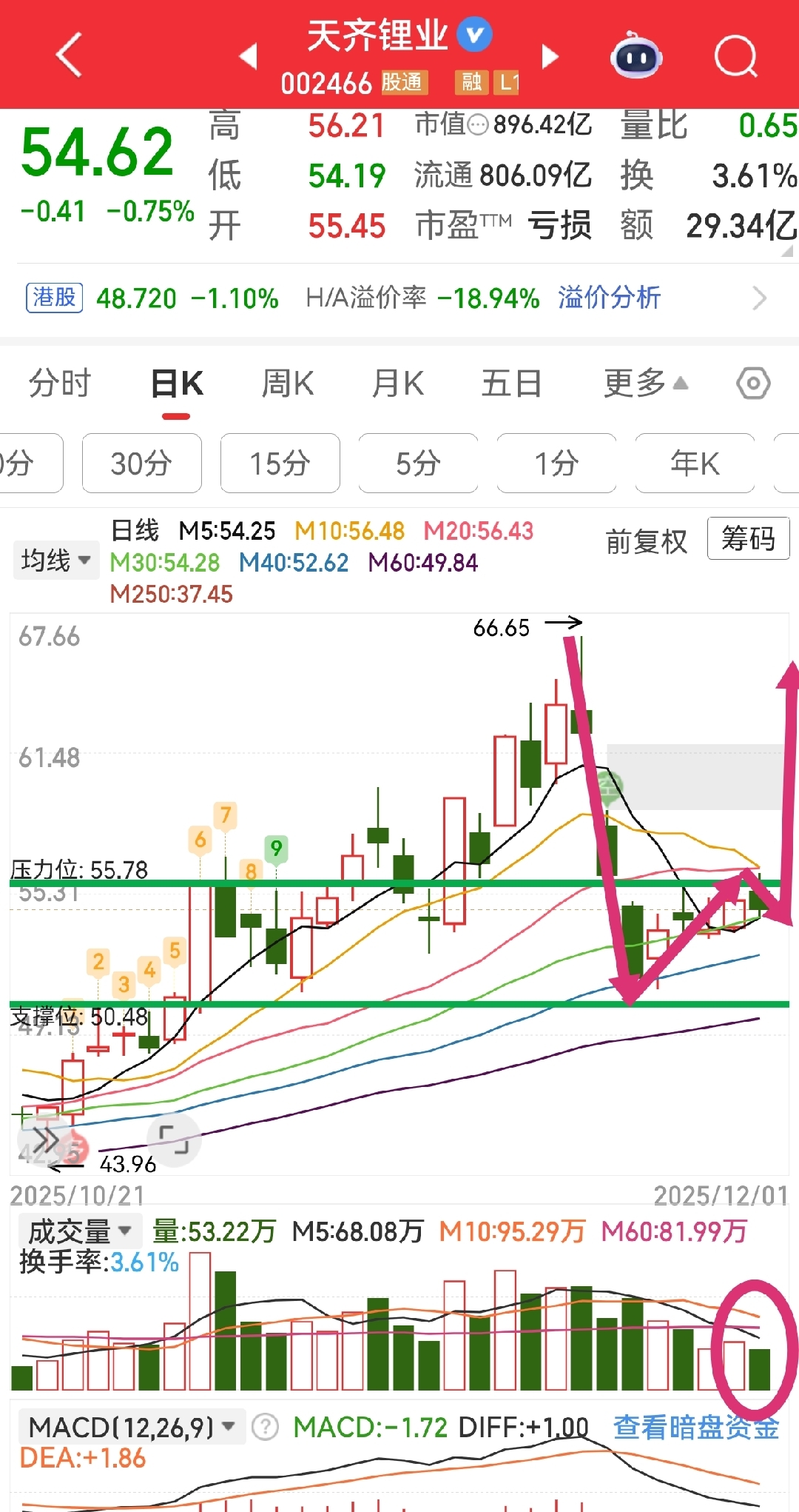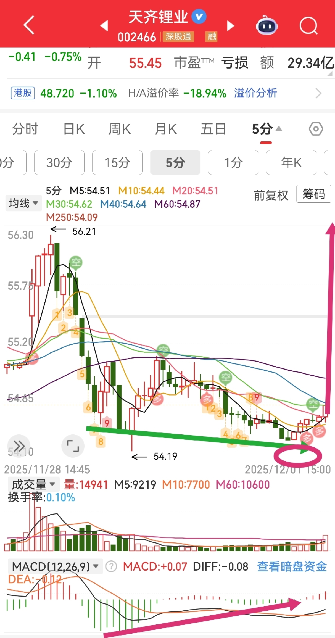 股价运行在智能撑压线之间,冲击压力位55.78元遇阻回落,今天的冲高引发5分钟k