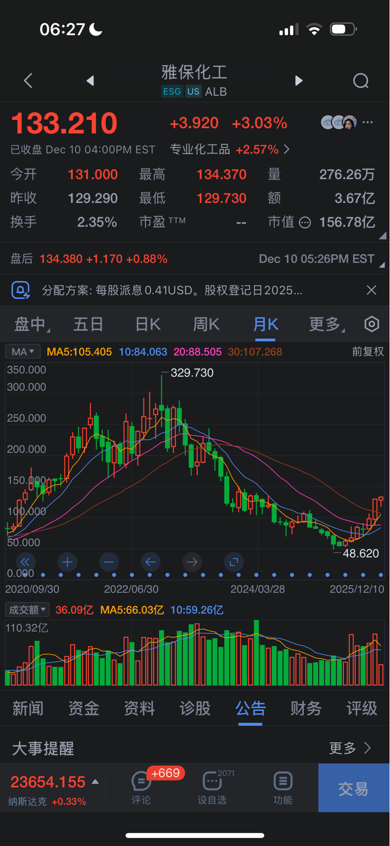 美联储如期降息25个基点,今晨收盘的全球有色金属期货全线大涨,其中锂矿资源股巨头雅保(ALB)涨超3%,再创近18个月以来新高。