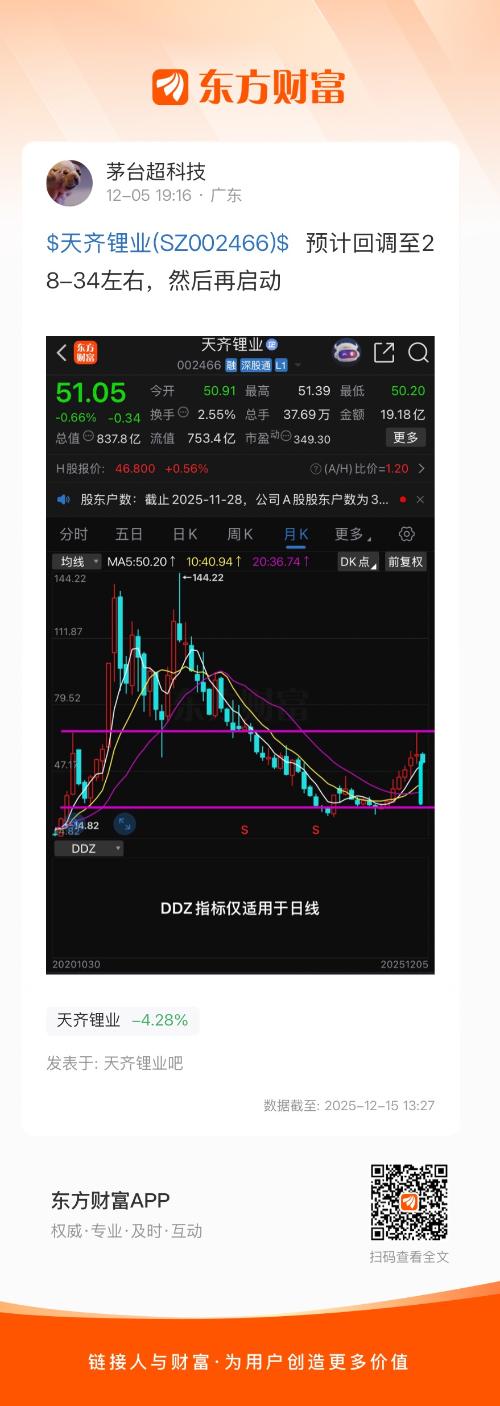 $天齐锂业(SZ002466)$  预计回调至28-34左右,然后再启动