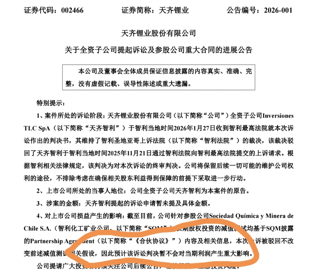 $天齐锂业(SZ002466)$ 你们多不看公告的吗,这个诉讼对业绩没有影响