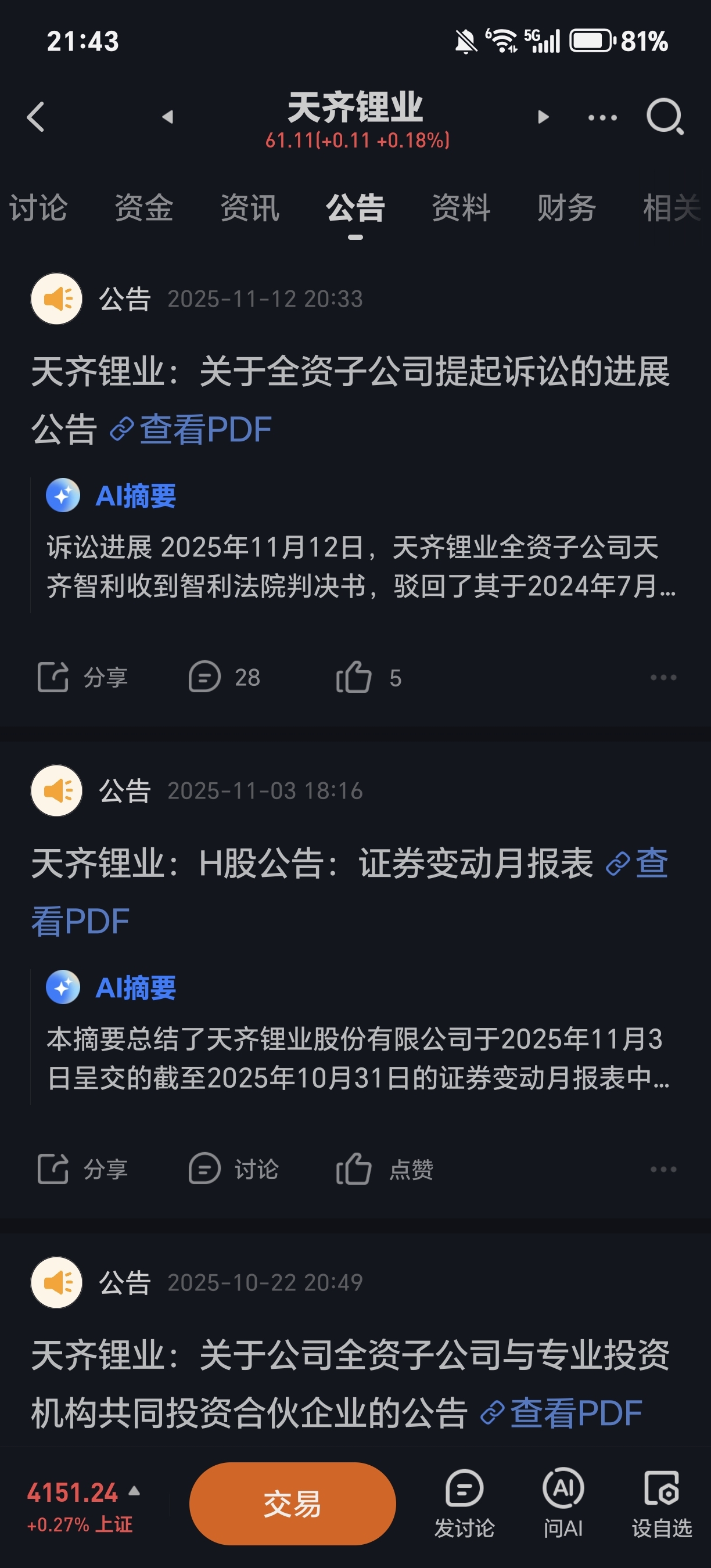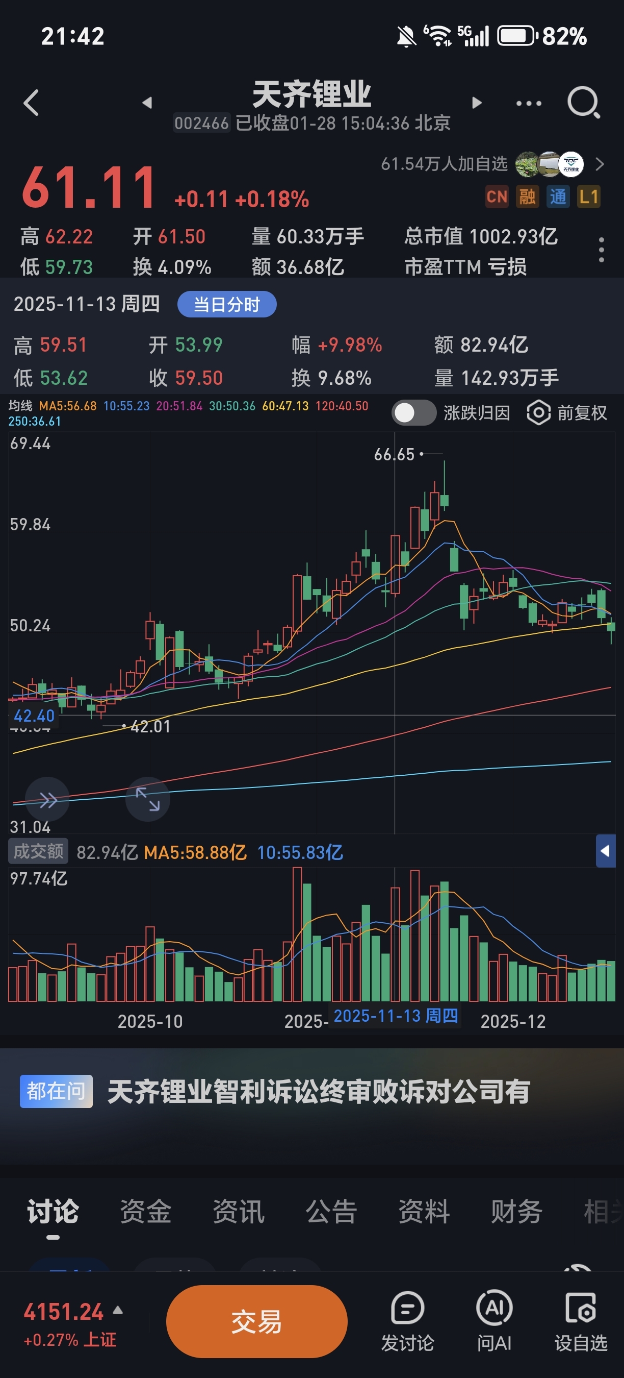 $天齐锂业(SZ002466)$ 11月12日就发了诉讼进展公告,当时很多小伙伴以为第二天跌停,结果第二天涨停,不仅如此,后面5个交易日整体大涨,创出了阶段性新高66.65。这次,61.11×1.1=67.22×1.1=73.94,是不是可以期待一下