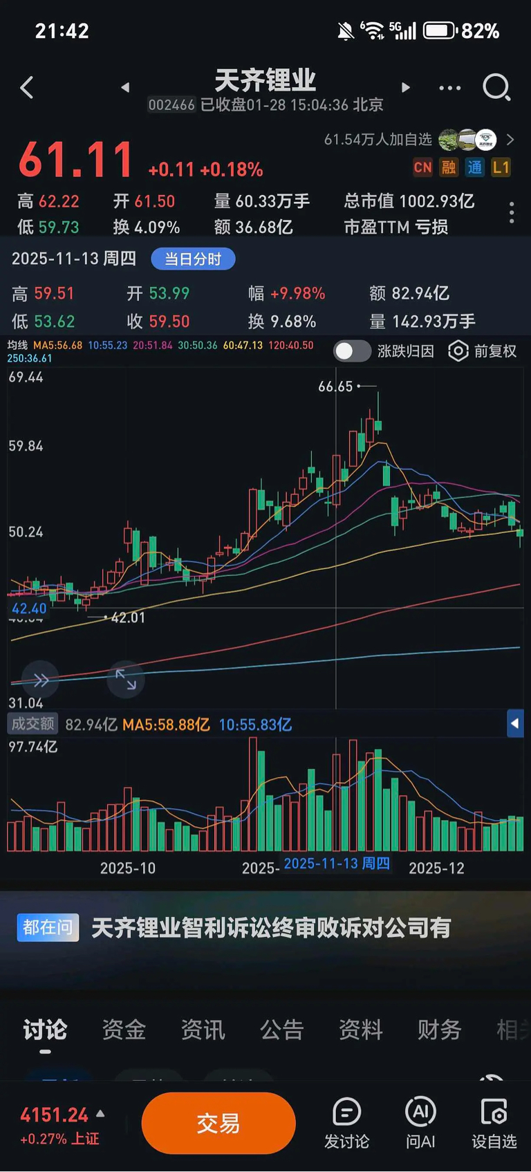 $天齐锂业(SZ002466)$ 11月12日就发了诉讼进展公告,当时很多小伙伴以为第二天跌停,结果第二天涨停,不仅如此,后面5个交易日整体大涨,创出了阶段性新高66.65。这次,61.11×1.1=67.22×1.1=73.94,是不是可以期待一下