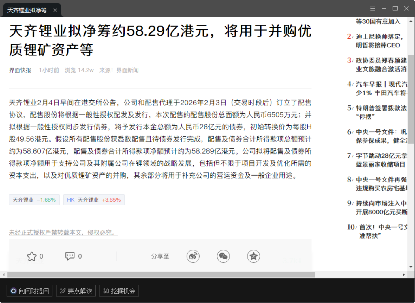 天齐港股临时性停牌,这是有并购优质锂矿资产的预期啊~今年天齐一定有大动作,值得期待~