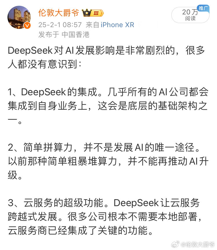 其实美国那些云服务公司都笑得合不拢嘴了。DeepSeek将极大的降低这些云服务公司的运营成本,注意是极大!