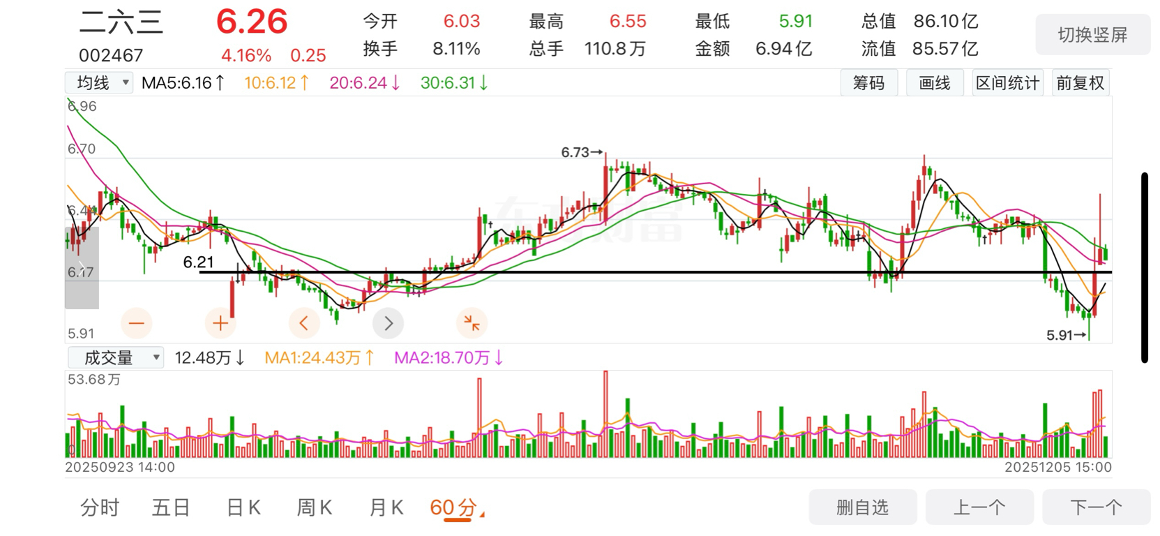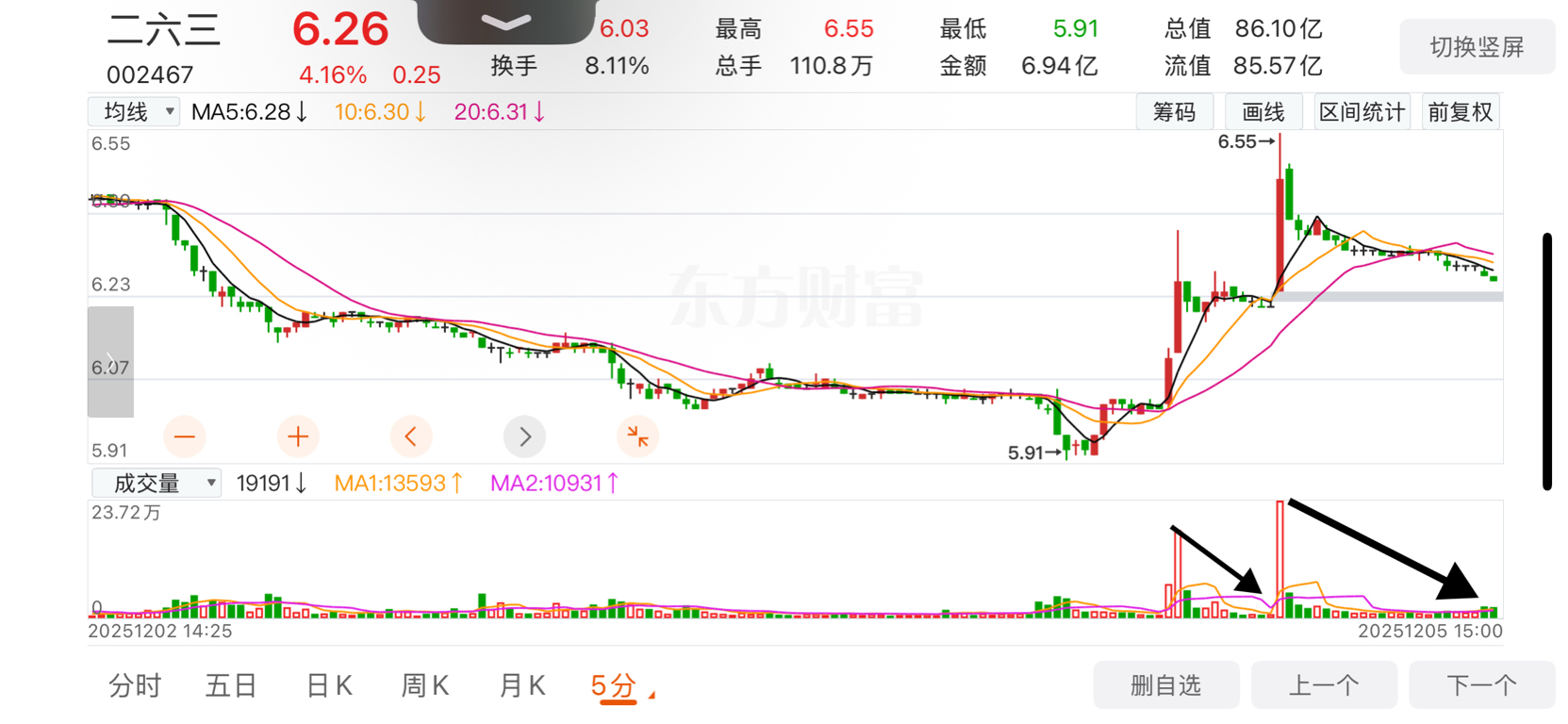$二六三(SZ002467)$ 第一次放量他就是超跌反弹,不应该第二次拉升,这个位置的走势就不应该拉涨停,筹码结构不对,拉升你们说自救,骗炮,这个位置说自救我当你开玩笑呢,在我看他也不是骗炮,从成交量上我看见的就是释放抛压,就是你们所谓的试盘,不是不能涨停,是没有那么操作的,控盘的脑子是正常的,t出去没毛病,问题不大,周一怎么走看不明白,少动,观望。