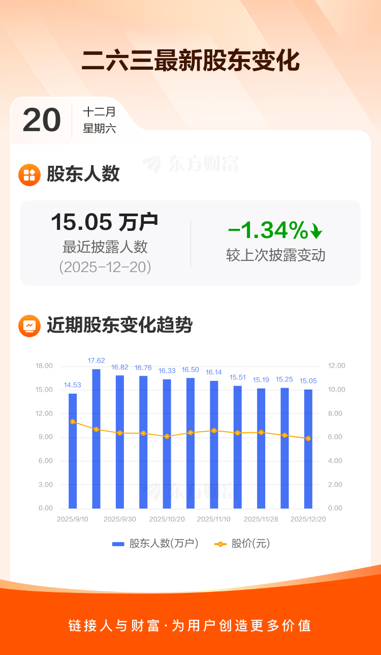 二六三最新披露数据显示,截至12月20日公司股东户数为15.05万户,较上期(2025年12月10日)减少2038户,降幅为1.34%。户均持有流通股数量由上期的8961股上升至9082股,户均持股金额由上期的5.53万元减少至5.36万元。