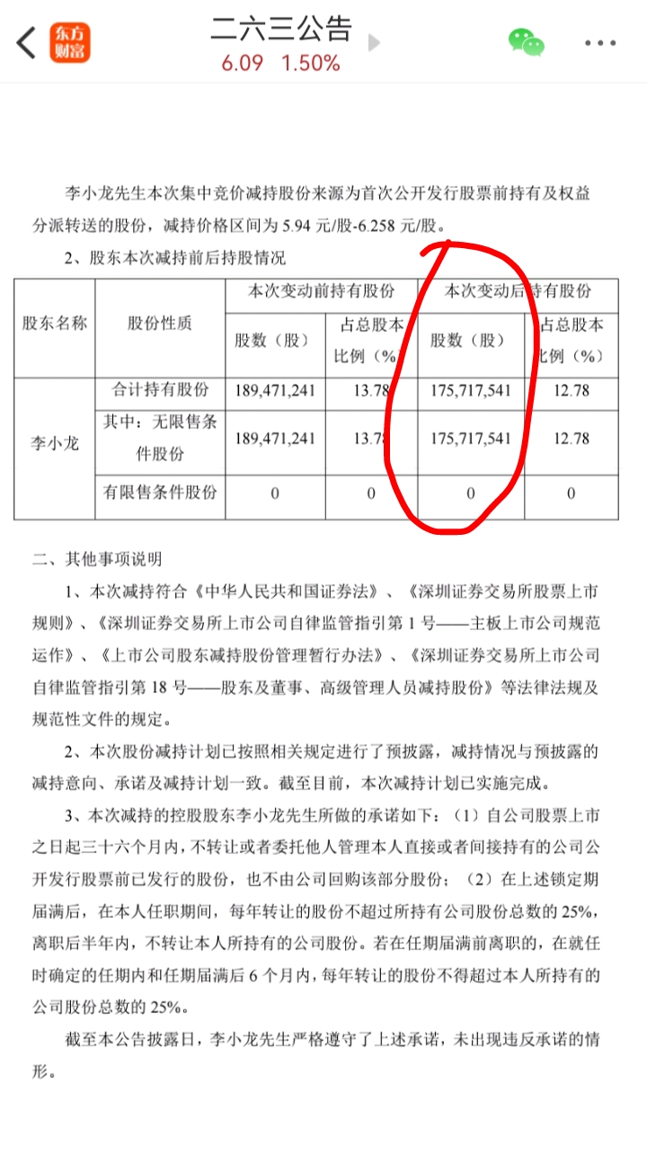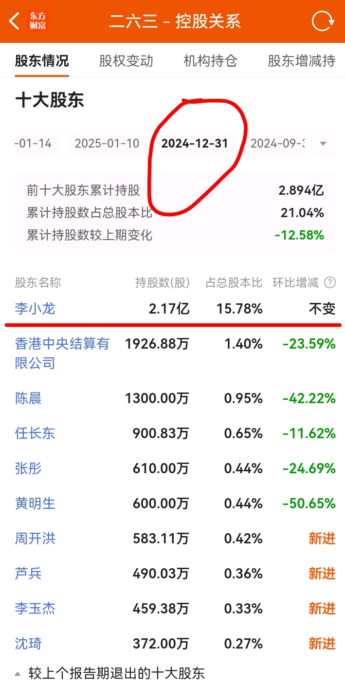 2024年底,李小龙持有2.17亿股。2025年底,李小龙持有1.757亿股。一