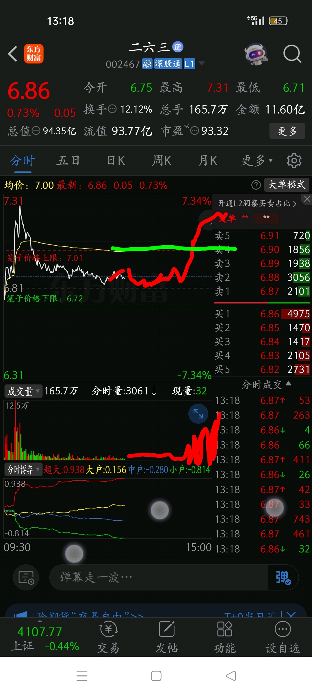 $二六三(SZ002467)$ 尾盘成交量放大,并且拉回分时均线之上即可!
