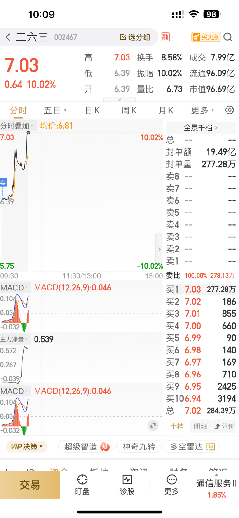 $二六三(SZ002467)$ 漂亮,底仓亏8个点走的,转眼一看涨停了……