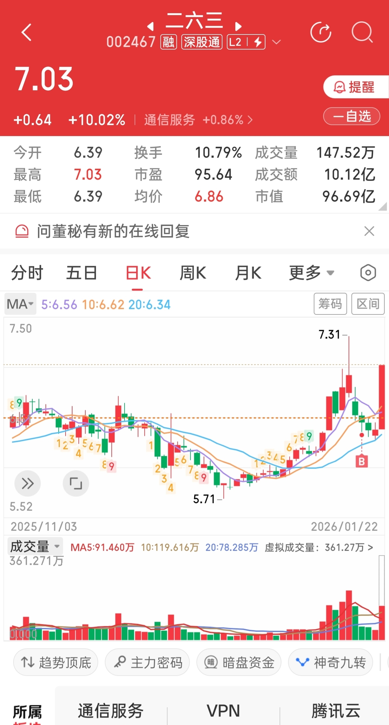 $二六三(SZ002467)$ 我还没打满仓位你就板上了?