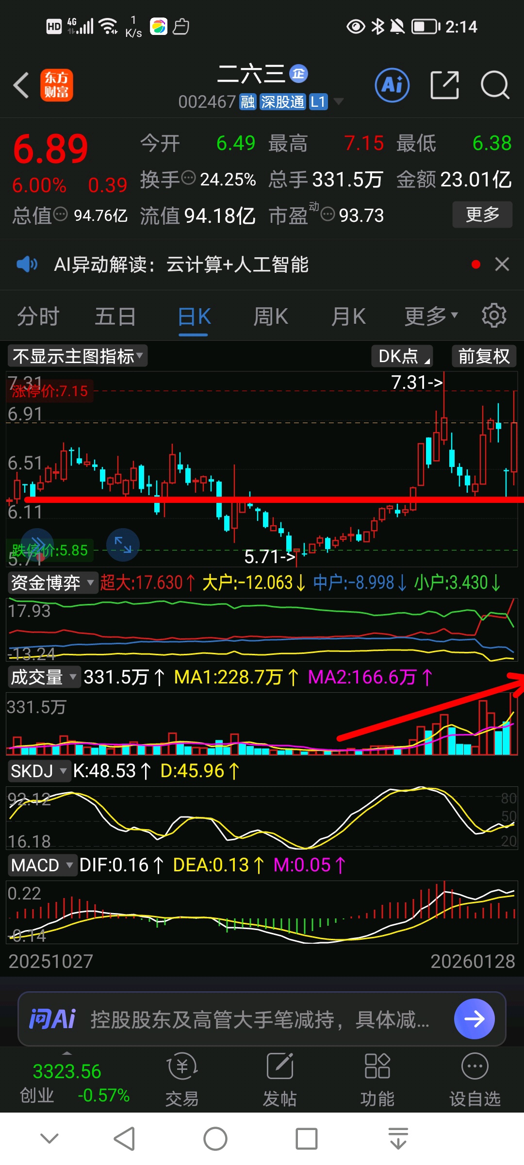 $二六三(SZ002467)$ 放量涨停后,震荡上涨缩量回调洗盘,右侧起涨空中加油,两阳夹阴,阴线上影线+下影线组合,二六三已经主力高度控盘,多方绝对占优势,不管现在要突破继续趋势上涨?还是以后?都是要上涨,势不可挡,珍惜当下筹码,锁仓不交易,加仓部分短线资金可做T,
