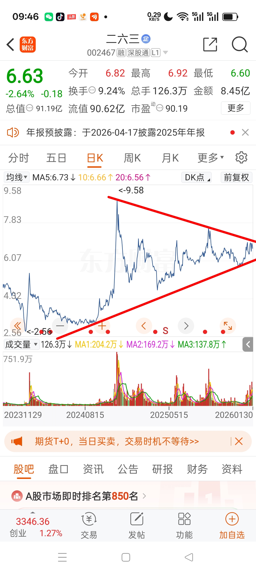 $二六三(SZ002467)$ 三角形整理末端%股价将一飞冲天