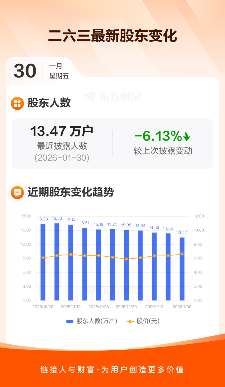 二六三最新披露数据显示,截至1月30日公司股东户数为13.47万户,较上期(2026年1月20日)减少8792户,降幅为6.13%。户均持有流通股数量由上期的9524股上升至1.01万股,户均持股金额由上期的6.08万元增加至6.73万元。