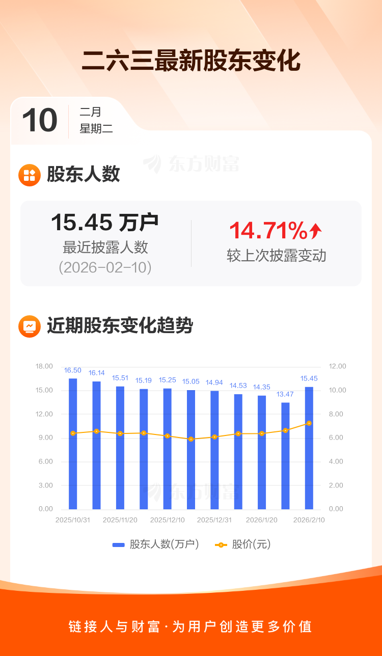 二六三最新披露数据显示,截至2月10日公司股东户数为15.45万户,较上期(2026年1月30日)增加1.98万户,增幅为14.71%。户均持有流通股数量由上期的1.01万股下降至8845股,户均持股金额由上期的6.73万元减少至6.40万元。