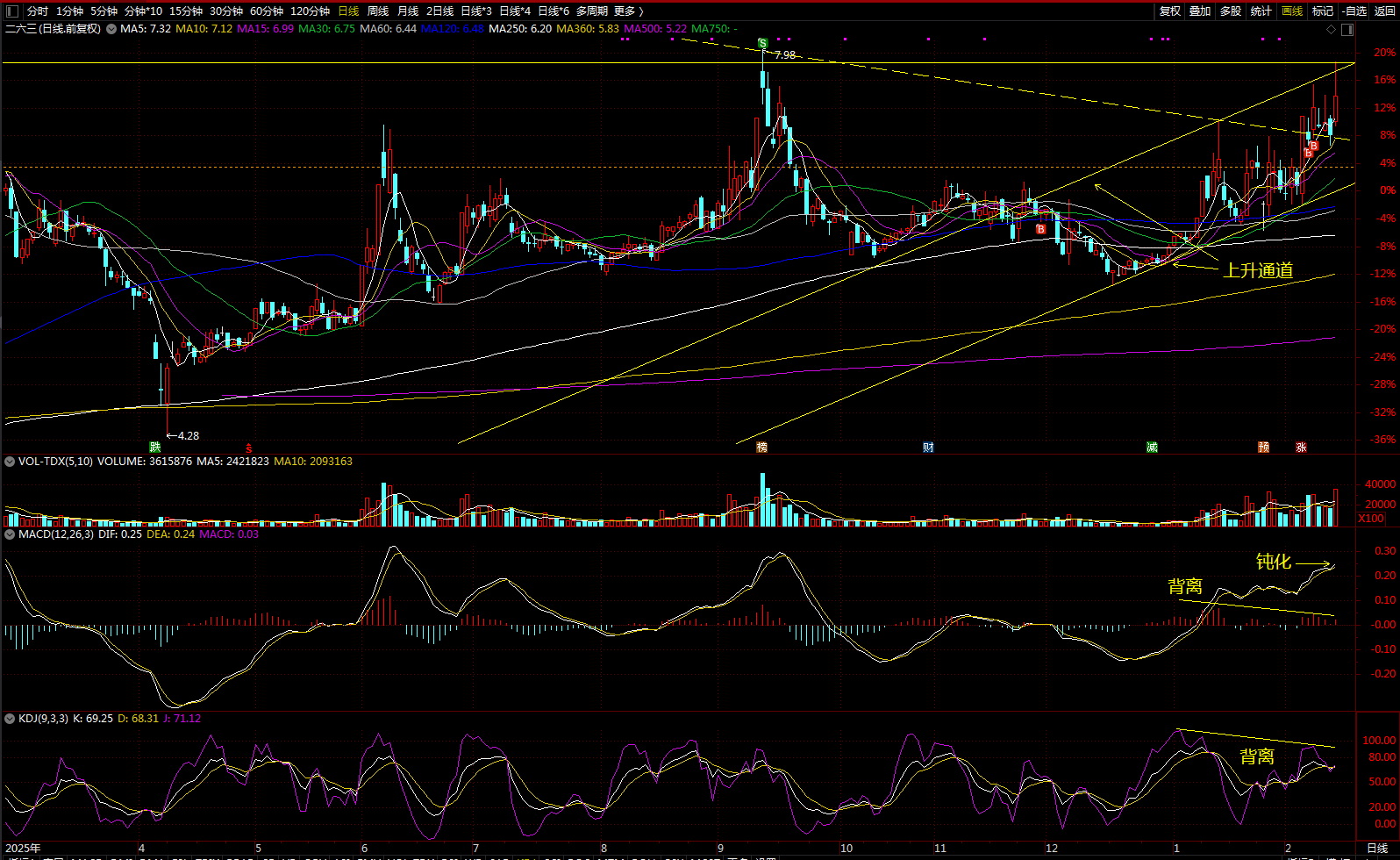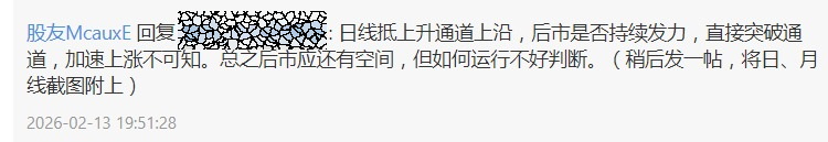 刚才给股友做了个补充回答:“刚才没说完整,补充一句:因已抵达日线上升通道上缘,所以常理说应做整理,倘若以中长线角度看,整理调整数日后抵达上升通道下沿后再回通道续起升势。但若以短线思维考虑,就不会如此行事,而是直接持续发力加速上涨,就此完成主升浪。”