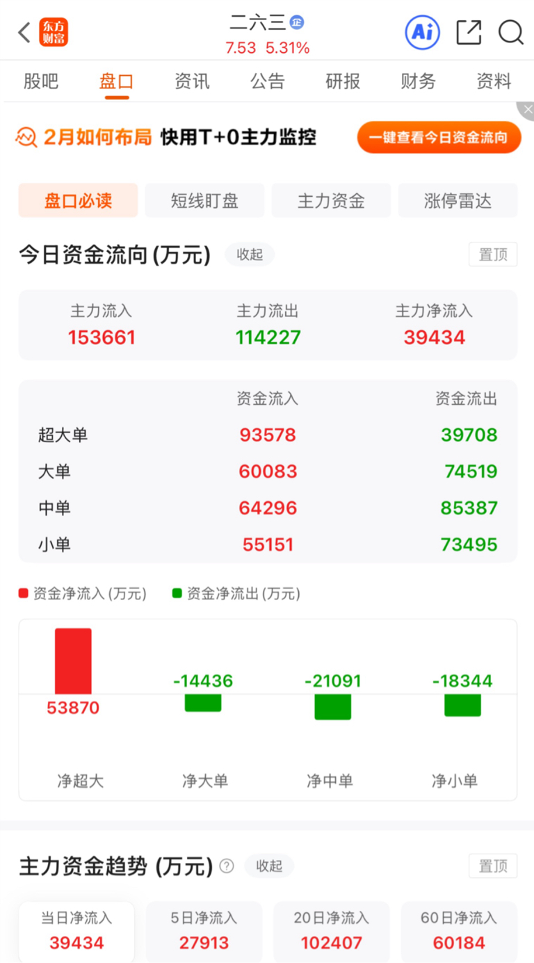 $二六三(SZ002467)$ 当天主力进的多,散户跑的多,