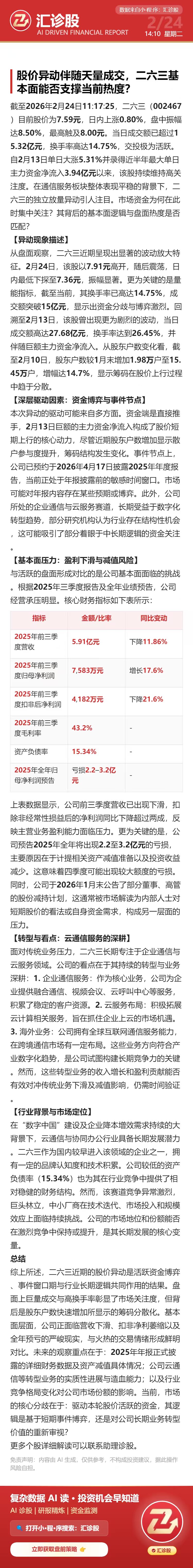 股价异动伴随天量成交,二六三基本面能否支撑当前热度?