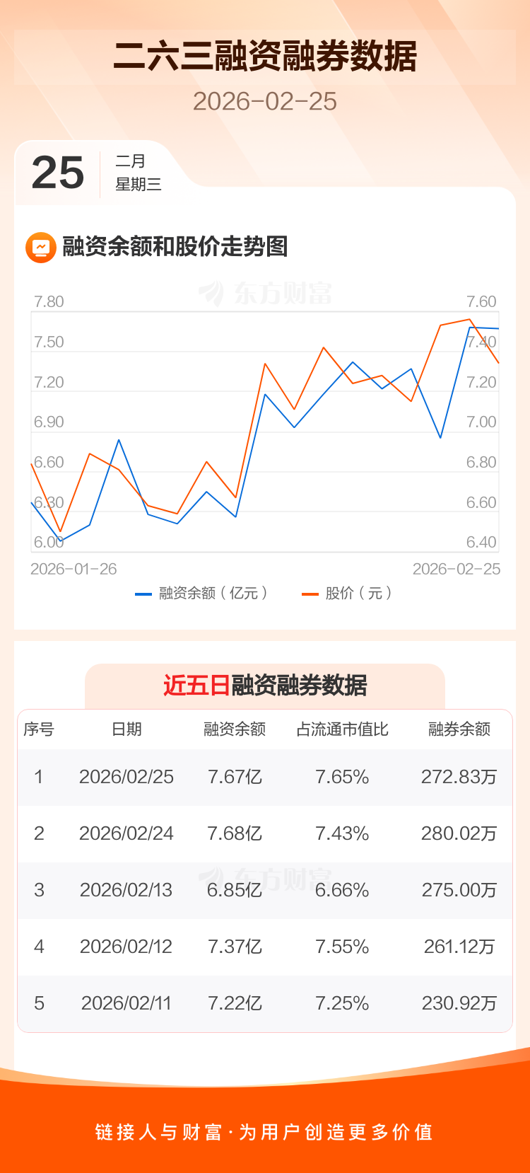 交易所最新数据显示,二六三于2026年2月25日获融资买入1.28亿元,融资偿还1.29亿元,当日融资净偿还45.81万元。目前,该股融资余额7.67亿,占流通市值比例为7.65%。