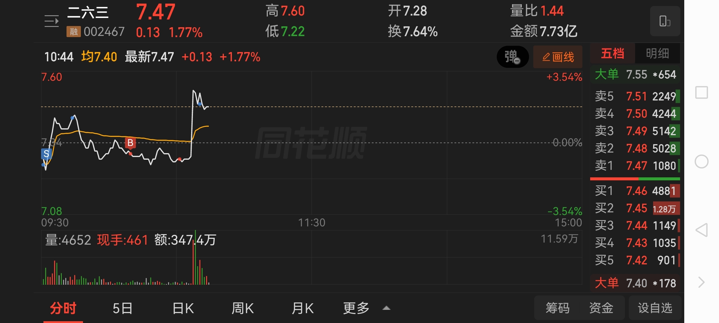 $二六三(SZ002467)$ 昨天抄在了半山腰,今天开盘操作失误反向了,接着就赶紧逢低买进,逢高再T,等待加仓机会。