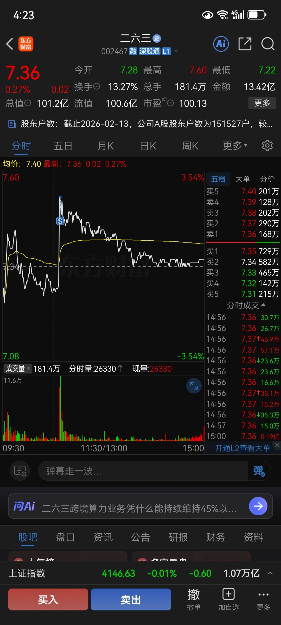 $二六三(SZ002467)$ 赚了一个鸡腿