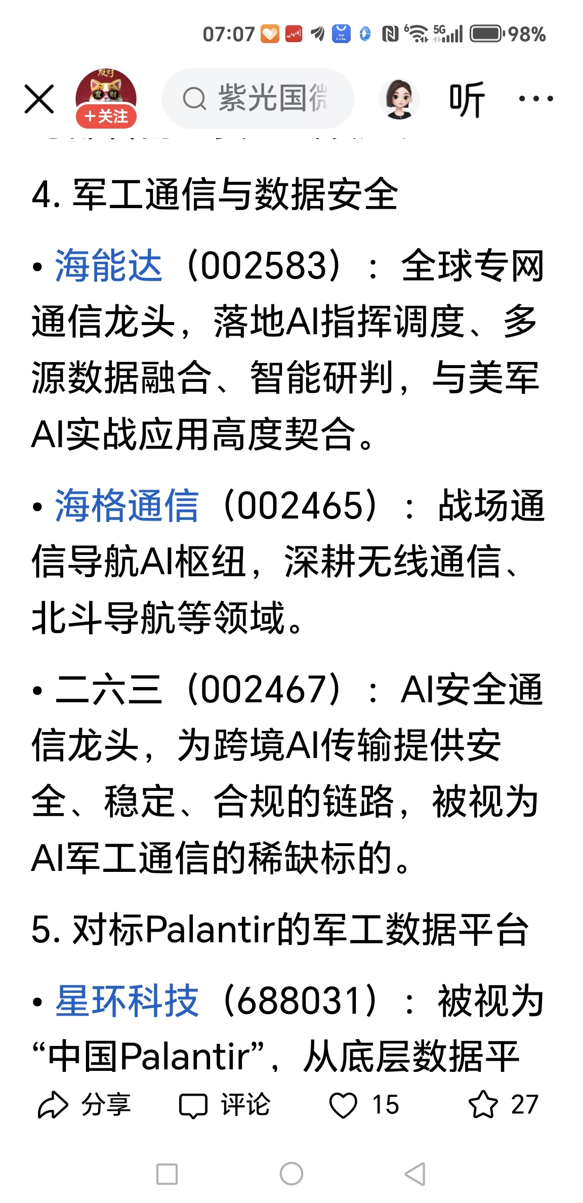 $二六三(SZ002467)$ A股AI+军工核心概念股