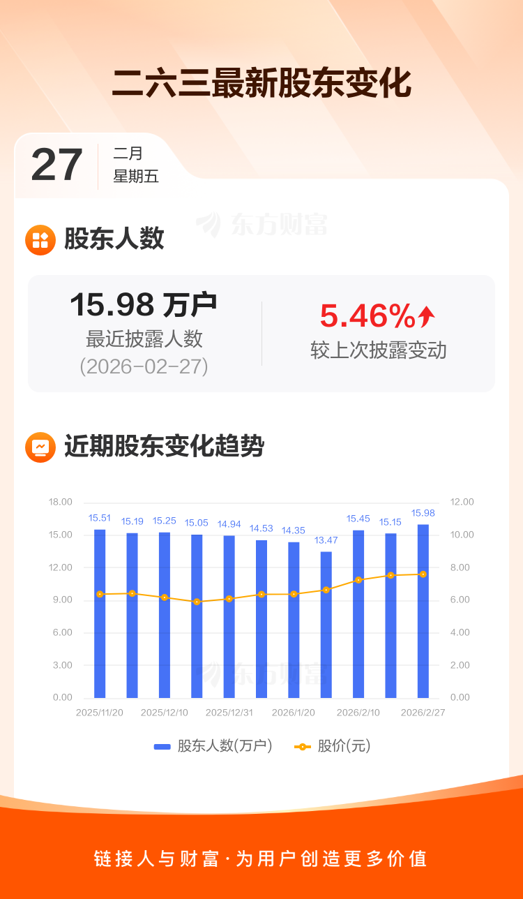 二六三最新披露数据显示,截至2月27日公司股东户数为15.98万户,较上期(2026年2月13日)增加8280户,增幅为5.46%。户均持有流通股数量由上期的9020股下降至8553股,户均持股金额由上期的6.79万元减少至6.50万元。