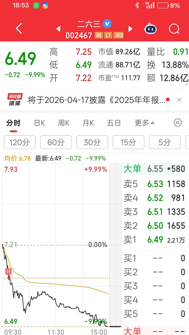 $二六三(SZ002467)$ 鄙人不才,全仓买入,杠杆拉满,成本6.919,仓位100%,今日基操已完成,晒图如下