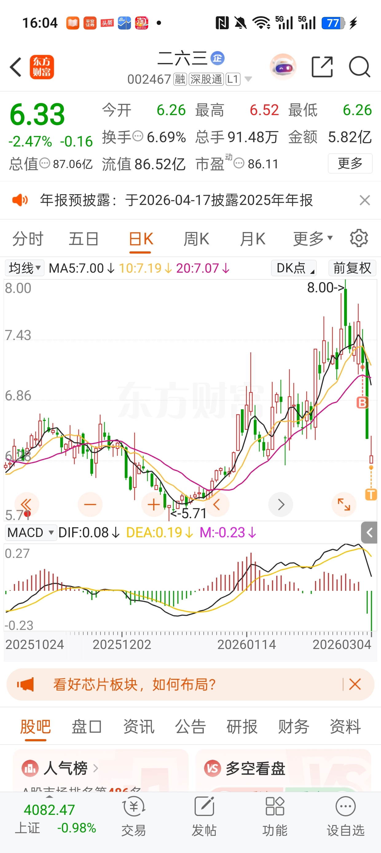 $二六三(SZ002467)$ 运气很背,进来两天就-13%,下不去手割……
