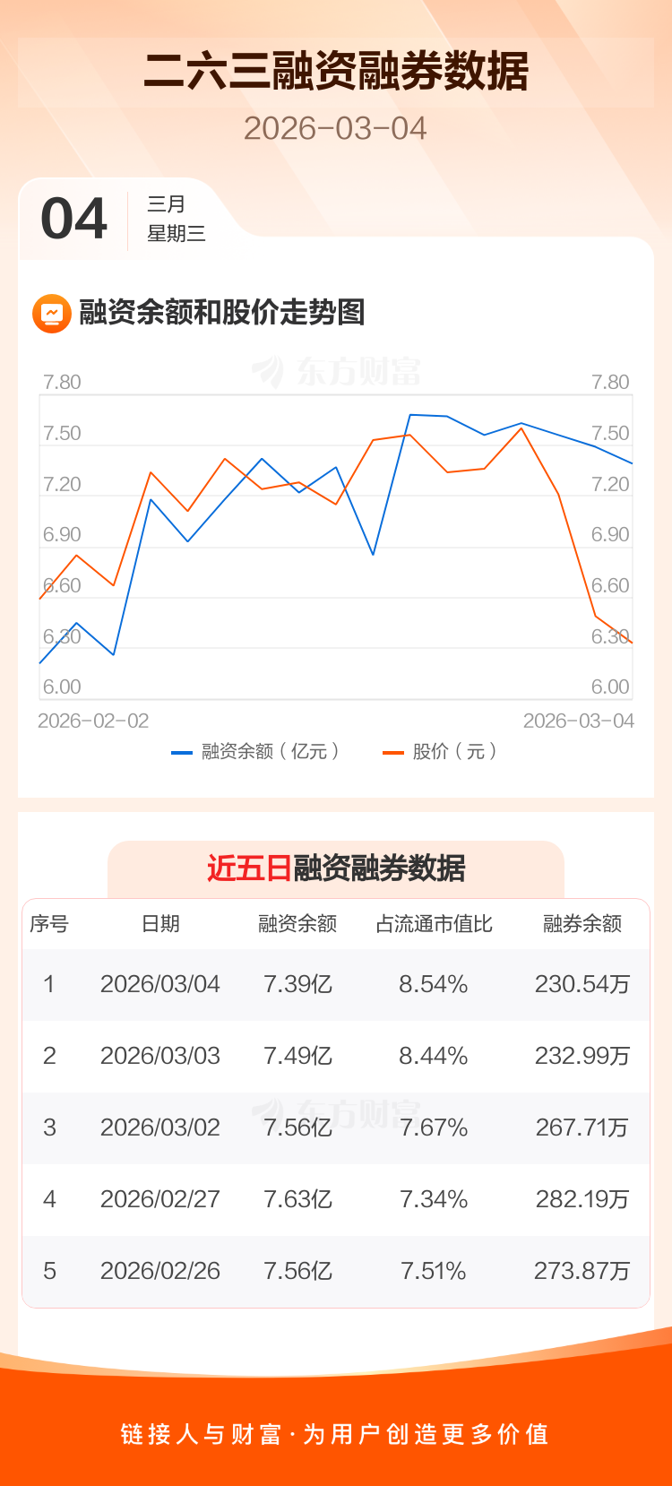 交易所最新数据显示,二六三于2026年3月4日获融资买入6402.43万元,融资偿还7424.67万元,当日融资净偿还1022.24万元。目前,该股融资余额7.39亿,占流通市值比例为8.54%。