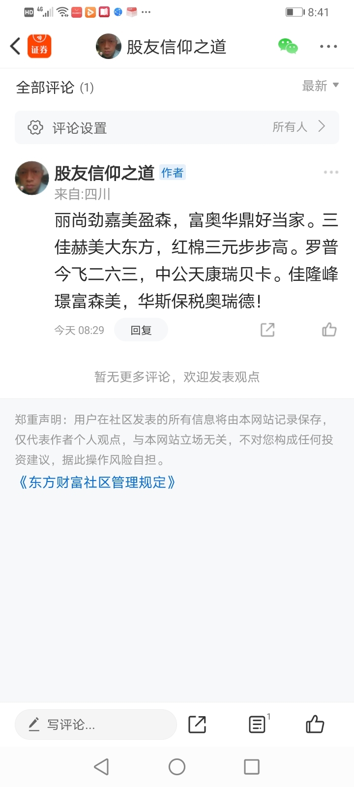 温馨提示: 1.根据《证券法》规定,禁止编造、传播虚假信息或者误导性信息,扰乱证券市场;2.用户在本社区发表的所有资料、言论等仅代表个人观点,与本网站立场无关,不对您构成任何投资建议。用户应基于自己的独立判断,自行决定证券投资并承担相应风险。《东方财富社区管理规定》